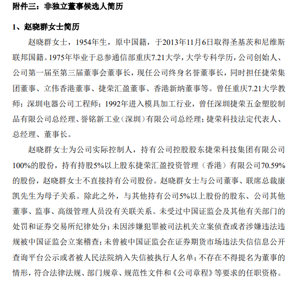 当前,捷荣技术董事会只剩下6名董事。因此,倘若公司董事会扩容至9人,则意味着公司需要补上3个董事席位的空缺。捷荣集团临时提案的第二项内容便是提名赵晓群、郑杰以及崔真洙担任公司第四届董事会非独立董事。
