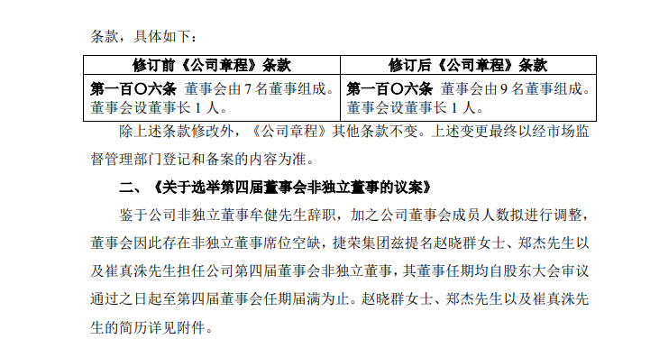 具体来看,捷荣集团提议公司将董事会成员人数由7名调整为9名,其中非独立董事6名,独立董事3名。“(董事会扩容是)为进一步提升公司治理水平,保证公司持续稳定经营。”捷荣集团表示。