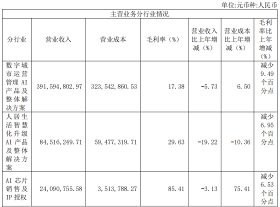 与此同时,三大业务的毛利率均出现下滑,其中数字城市场景下业务毛利率17.38%,同比减少9.49个百分点;人居生活场景下业务毛利率29.63%,同比减少6.95个百分点;AI芯片销售及IP授权毛利率85.41%,同比减少6.53个百分点。