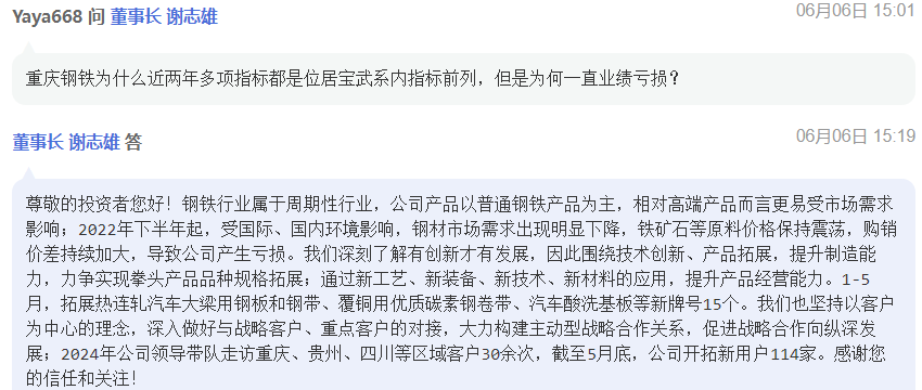 业绩说明会上,有投资者问重庆钢铁董事长谢志雄“重庆钢铁为什么近两年多项指标都是位居宝武系内指标前列,但是为何一直业绩亏损?”
