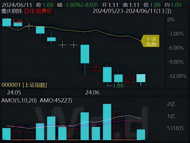 股价方面,自5月23日起,重庆钢铁A股持续下跌。6月5日,盘中再次刷新历史新低,股价最低至1.08元/股,逼近1元面值退市“红线”。
