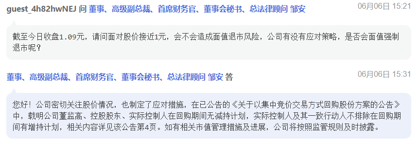 “截至今日收盘1.09元,请问面对股价接近1元,会不会造成面值退市风险,公司有没有应对策略,是否会面值强制退市呢?”在6月6日的重庆钢铁2023年度业绩说明会期间,有投资者提问。