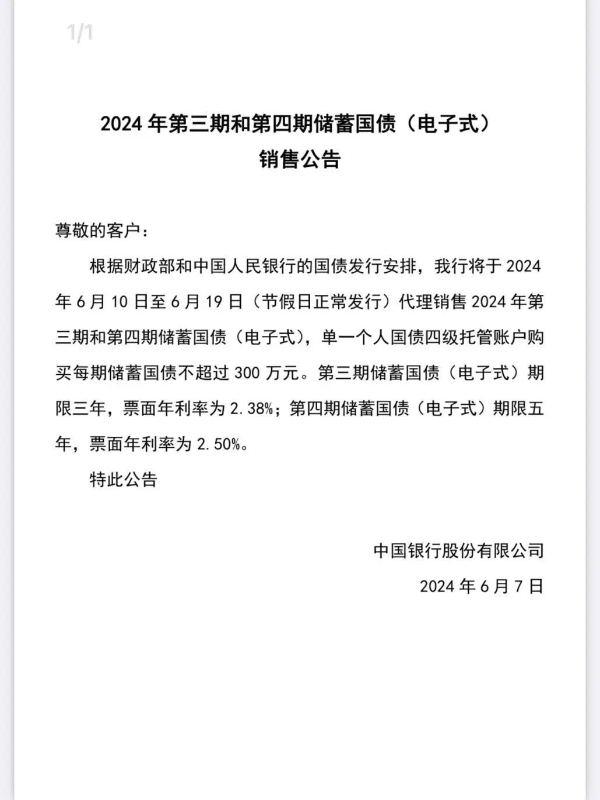 6月7日,农业银行等多家银行公告称,6月10日至19日,将售卖2024年第三期和第四期储蓄国债(电子式)。