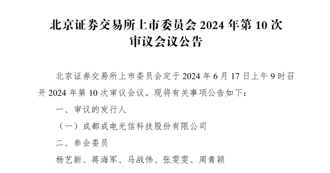 6月7日晚间,北交所官网显示,上市委定于6月17日上午召开审议会议,审议成电光信首发申请。这是北交所上市委会议在暂停4个月之后,首次重启。与此同时,这也意味着,三大交易所的上市委会议均已恢复。据悉,暂停期间,监管层对上市规则等进行了完善。