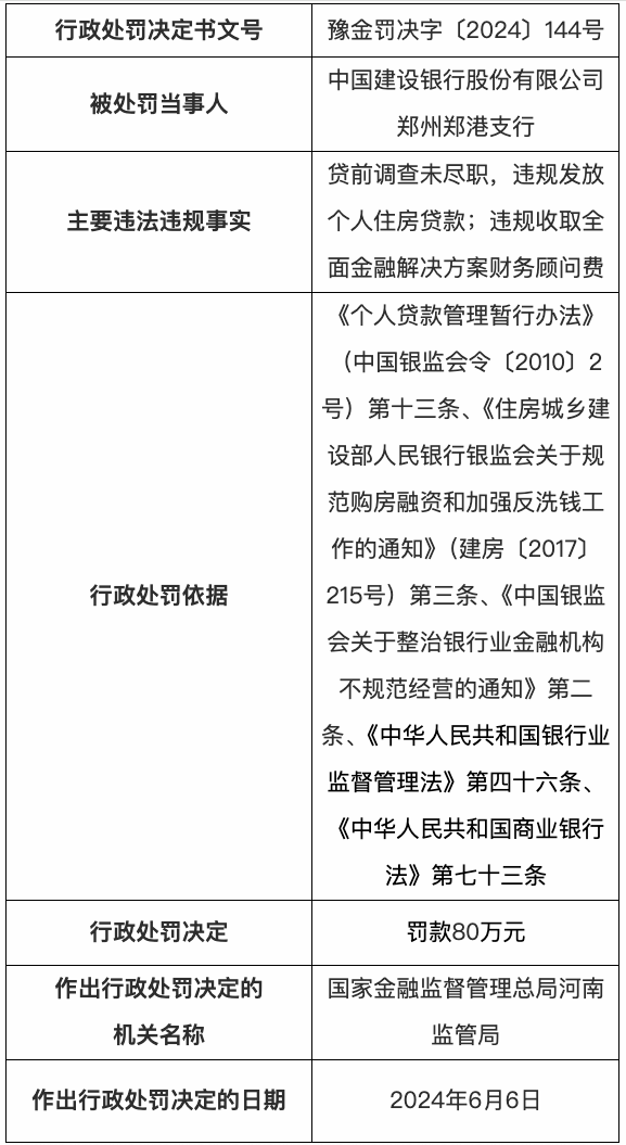 6月7日,国家金融监督管理总局(河南监管局)行政处罚信息公开表显示,2024年6月6日,中国建设银行股份有限公司郑州郑港支行被处罚款80万元,主要违法违规事实为:贷前调查未尽职,违规发放个人住房贷款;违规收取全面金融解决方案财务顾问费。
