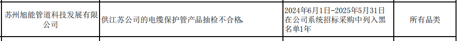 公告显示,苏州旭能管道科技发展有限公司,在供江苏公司的电缆保护管产品抽检不合格。