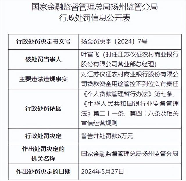 时任江苏仪征农村商业银行股份有限公司营业部总经理叶富飞,对江苏仪征农村商业银行股份有限公司贷款资金用途管控不到位负有责任,被警告并处罚款6万元。