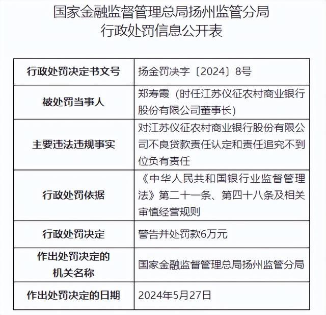 时任江苏仪征农村商业银行股份有限公司董事长郑寿霞,对江苏仪征农村商业银行股份有限公司不良贷款责任认定和责任追究不到位负有责任,被警告并处罚款6万元;