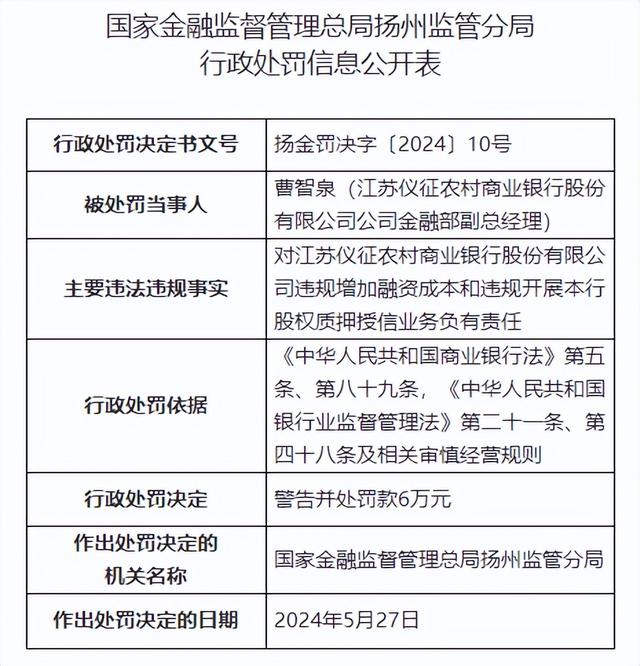 同时,江苏仪征农村商业银行股份有限公司公司金融部副总经理曹智泉对江苏仪征农村商业银行股份有限公司违规增加融资成本和违规开展本行股权质押授信业务负有责任,被警告并处罚款6万元;