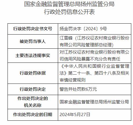 江苏仪征农村商业银行股份有限公司风险管理部总经理江雪峰对江苏仪征农村商业银行股份有限公司信用风险暴露不充分负有责任,被警告并处罚款6万元;