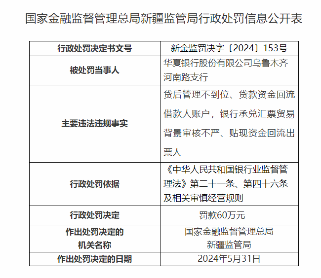 具体来看,华夏银行乌鲁木齐河南路支行的主要违法事实(案由)为:贷后管理不到位、贷款资金回流借款人账户,银行承兑汇票贸易背景审核不严、贴现资金回流出票人。