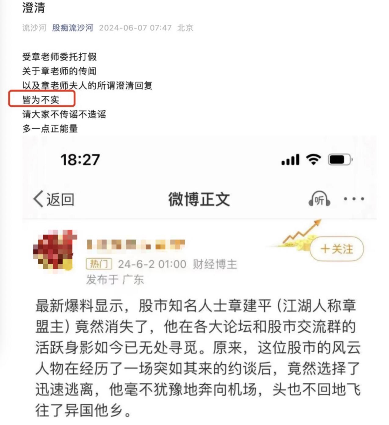 与此同时,6月7日,另一牛散“股痴流沙河”在社交平台受章建平委托发布澄清公告,该文称:“受章老师委托打假,关于章老师的传闻以及章老师夫人的所谓澄清回复,皆为不实”,并希望大家“不传谣、不造谣”。