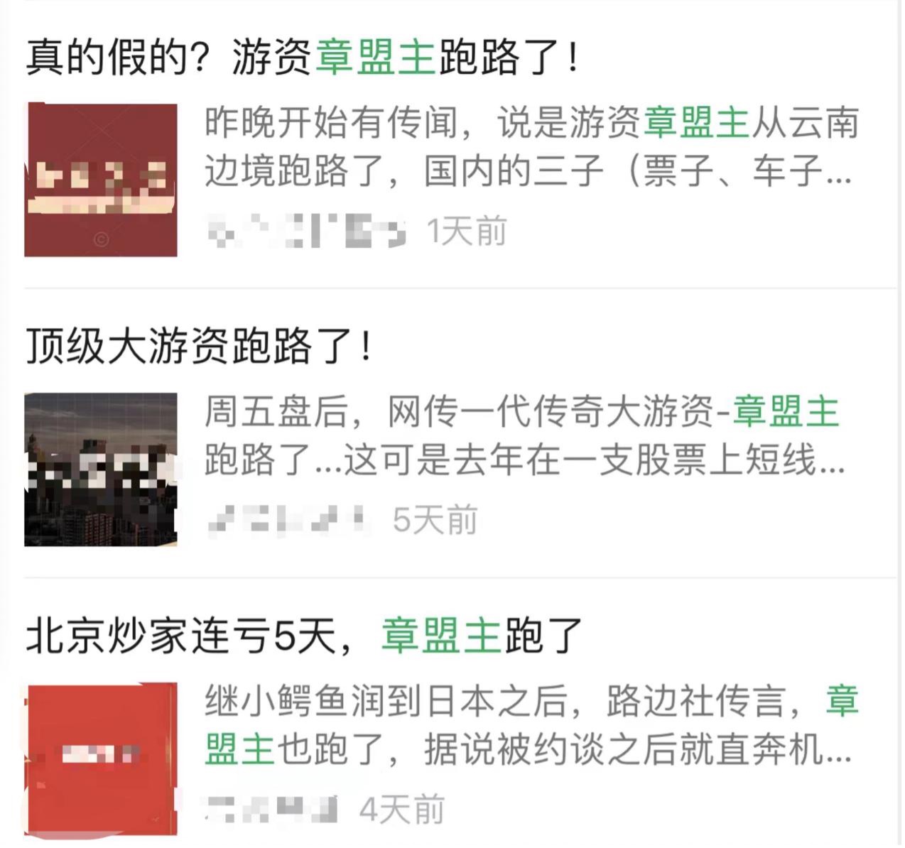 5月底开始,关于杭州顶级游资出事的传言在社交平台流传,引发市场猜测。到了6月初,更直接有自媒体开始炒作“游资章盟主跑路了”,虽然是未经核实的信息,但是得到广泛传播。其中,有的小作文版本是“被约谈后,直奔机场逃离”,也有演绎版本称“从云南边境跑路”等。
