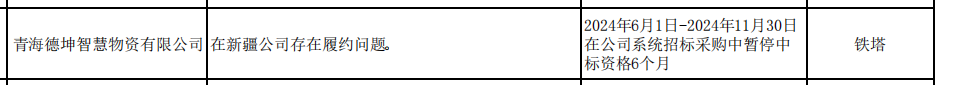 相关处理措施为,2024年6月1日-2024年11月30日在公司系统招标采购中暂停中 标资格6个月。处理范围为,铁塔。