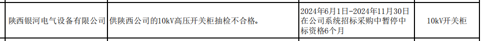 公告显示,陕西银河电气设备有限公司,在供陕西公司的10kV高压开关柜抽检不合格。