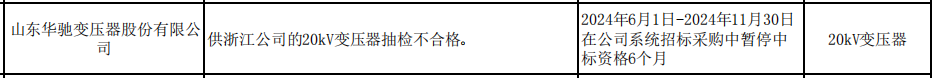 相关处理措施为,2024年6月1日-2024年11月30日在公司系统招标采购中暂停中 标资格6个月。处理范围为,20kV变压器。