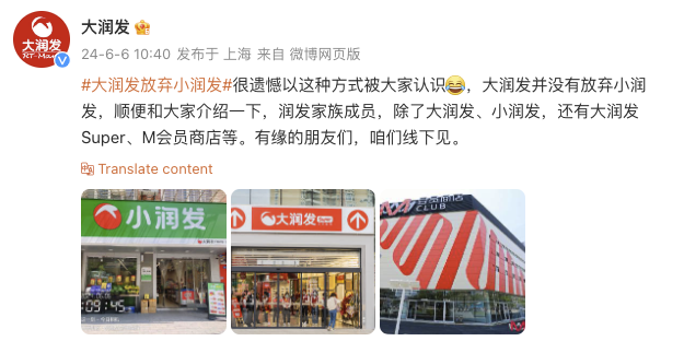 6月6日,大润发官方微博发文称,大润发并没有放弃小润发。据介绍,润发家族成员,除了大润发、小润发,还有大润发Super、M会员商店等。