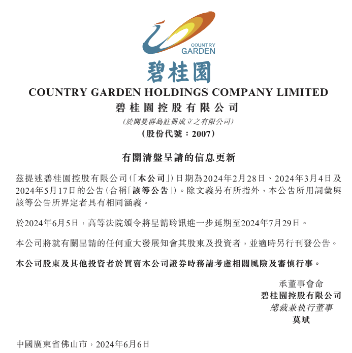 碧桂园6月6日午间在港交所公告,于2024年6月5日,香港高等法院颁令将清盘呈请聆讯进一步延期至2024年7月29日。