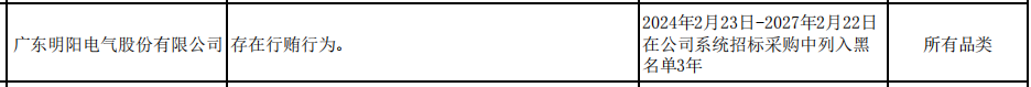 公告显示,广东明阳电气股份有限公司,存在行贿行为。