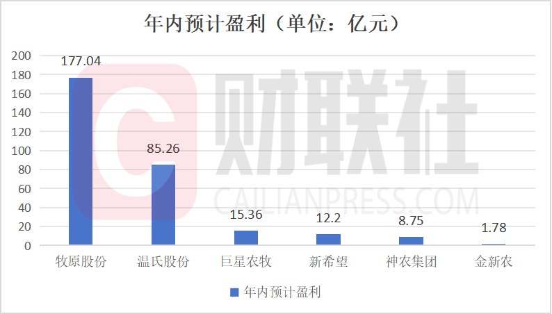 据此类推,巨星农牧(603477.SH)、神农集团(605296.SH)、新希望(000876.SZ)、金新农(002548.SZ)和温氏股份等今年或有望分别盈利不低于15亿元、8亿元、12亿元、1亿元和85亿元。