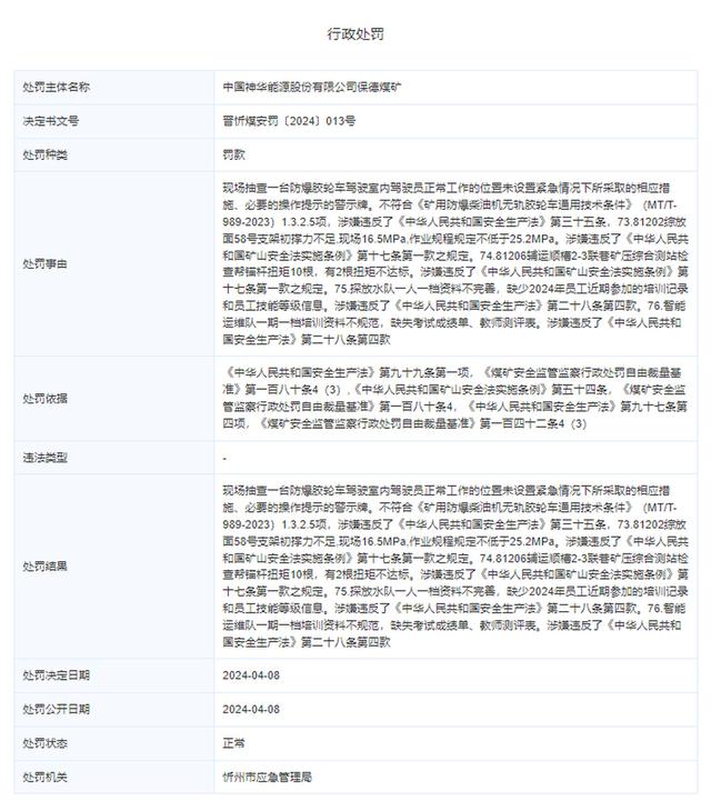 中国神华能源股份有限公司保德煤矿作为一家隶属于中国神华能源股份有限公司的煤炭开采企业,此次被处以罚款,再次提醒了所有煤炭企业必须严格遵守安全生产法规,确保员工的安全和生产的顺利进行。