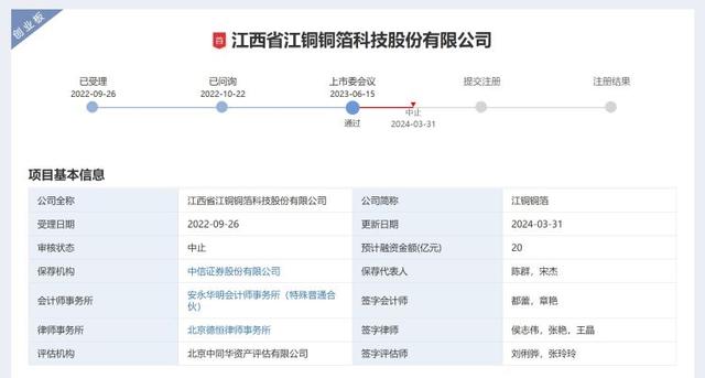 深交所官网显示,江铜铜箔IPO事项目前呈中止状态。