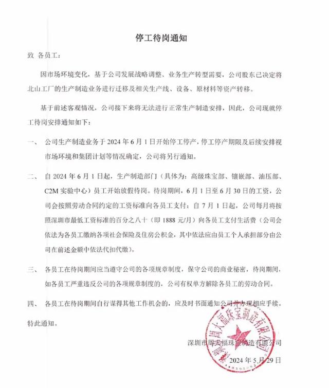 该通知落款为周大福深圳珠宝制造有限公司,对此蓝鲸记者致电该公司电话,但并未接通。蓝鲸记者联系到多位周大福深圳工厂员工确认了上述通知的真实性。