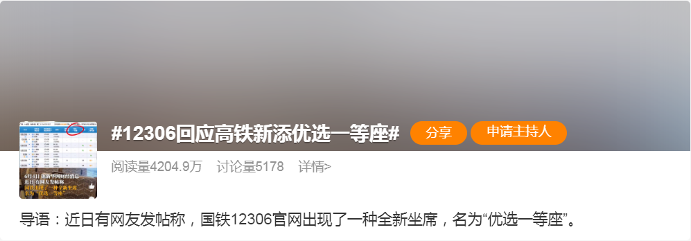 高铁新增“优选一等座”选项。5日上午,话题#12306回应高铁新添优选一等座#冲上热搜。