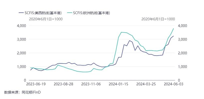 据上海证券报,上海航运交易所6月3日公布数据,上海出口集装箱结算运价指数(SCFIS)欧洲航线与美西航线双双上涨,且均创出今年以来新高: