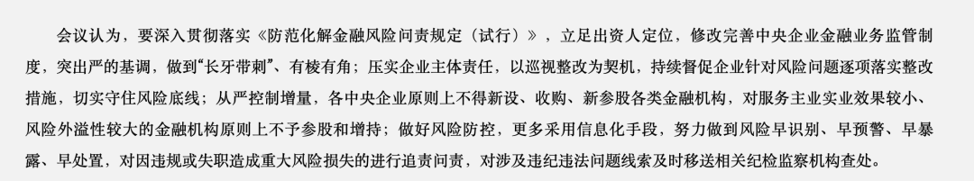 此次会议认为,要深入贯彻落实《防范化解金融风险问责规定(试行)》,立足出资人定位,修改完善中央企业金融业务监管制度,突出严的基调,做到“长牙带刺”、有棱有角;压实企业主体责任,以巡视整改为契机,持续督促企业针对风险问题逐项落实整改措施,切实守住风险底线。