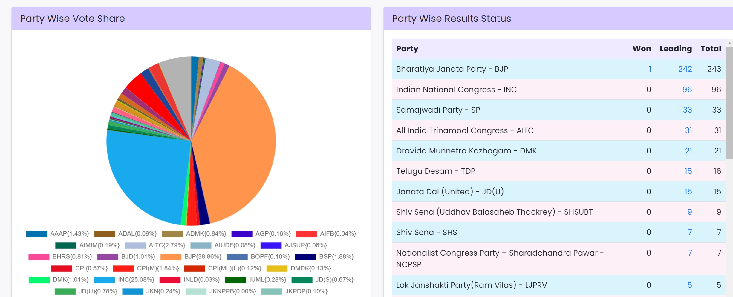 首先毫无疑问的是莫迪领导的执政联盟能够取得胜利。根据初步计票情况,莫迪领导的全国民主联盟在印度人民院(议会下院)的选举中维持领先,有望获得取胜所需的272个简单多数席位。其中莫迪的印度人民党(BJP)有望获得243个席位。