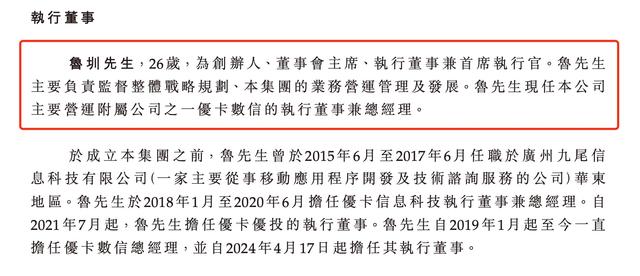 鲁圳于2018年1月至2020年6月担任优卡信息科技执行董事兼总经理,彼时其20岁。自 2021年7月起,鲁圳担任优卡优投的执行董事。鲁圳自2019年1月起至今一直 担任优卡数信总经理,并自2024年4月17日起担任其执行董事。