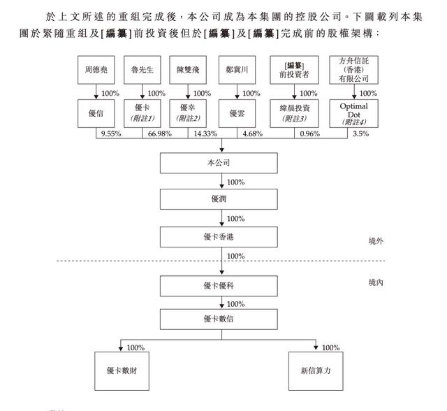 重组完成后,鲁圳持有的优卡、陈双飞持有的优幸、周德尧持有的优信、郑冀川持有的优云及纬晨投资分别持有优卡集团全部已发行股本69.41%、14.85%、9.90%、4.85%及0.99%的权益。