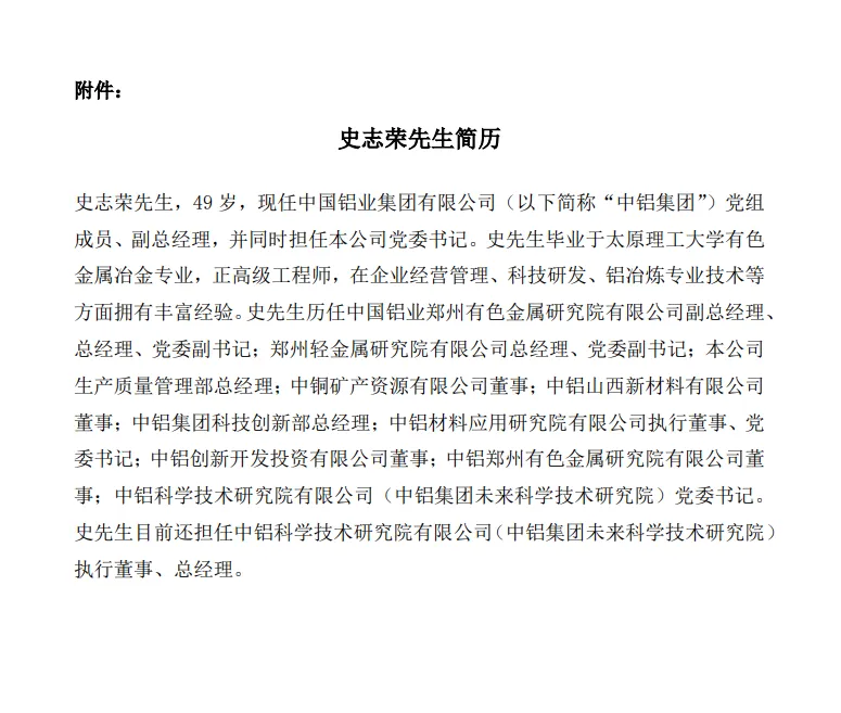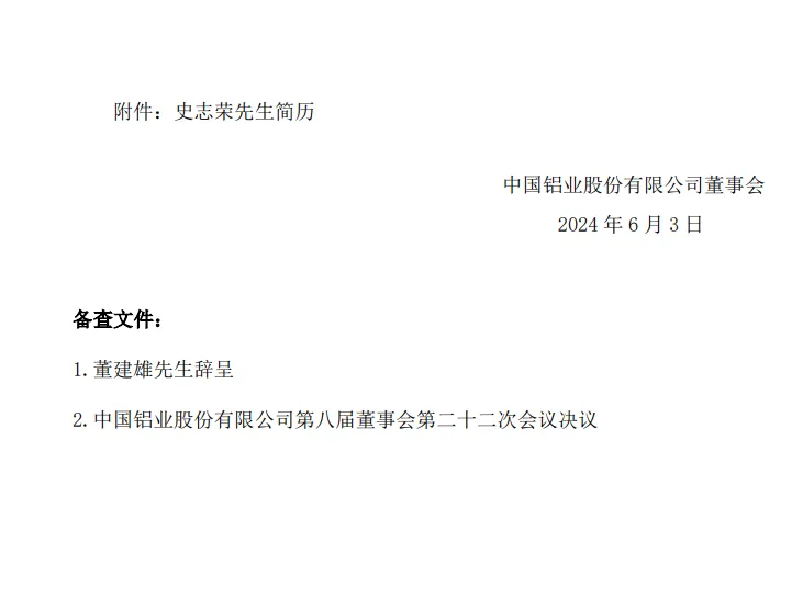 6月3日,中国铝业发布公告称,因工作需要,董建雄先生于6月3日向公司董事会递交书面辞呈,提请辞去公司董事长、执行董事及在董事会下设各专门委员会中的一切职务,自公司股东大会选举产生新任执行董事后生效。
