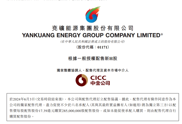 消息面上,兖矿能源6月3日公告称,拟以每股17.39港元向至少六名承配人配售2.85亿股H股,预期配售事项所得款项总额将约为49.6亿港元。据介绍,兖矿能源H股配售价较6月3日收市价19.30港元折让约9.90%,配售股份约占扩大后已发行H股的约9.09%及扩大后已发行股份的约3.69%。