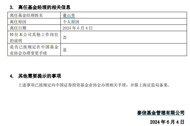 据泰信基金公告,董山青无转任公司其他工作岗位的安排,已按规定在中国基金业协会办理变更手续。董山青卸任后,泰信互联网+交由杨显管理,泰信智选成长交由朱志权、杨显共同管理。