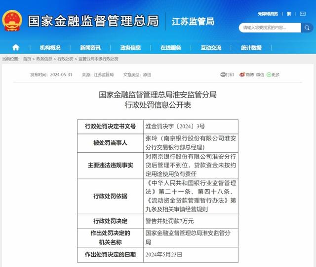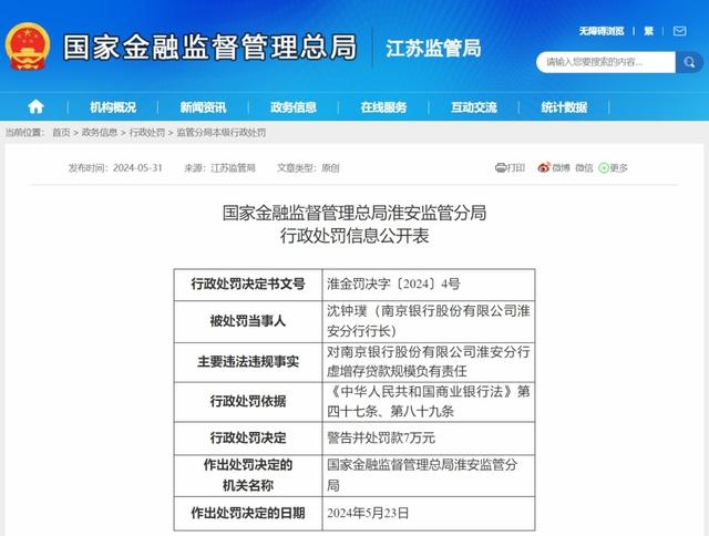 近日,南京银行股份有限公司淮安分行(以下简称“南京银行淮安分行”)被国家金融监督管理总局淮安监管局处罚265万元,淮安分行行长沈钟璞等3名负责人被警告并各罚款7万元。