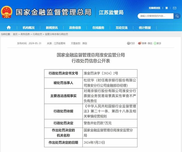 此外,该行多位相关负责人也被处罚。根据行政处罚信息公开表显示,南京银行淮安分行行长沈钟璞、交易银行部总经理张玲,以及时任南京银行淮安分行公司金融部总经理杜欣华对上述违法违规事实负有责任,国家金融监管总局淮安监管分局分别给与上述三人警告,并各处罚款7万元。
