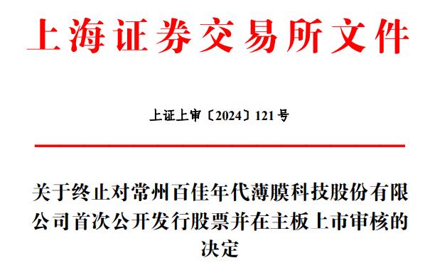 据上交所官网消息,上交所决定终止常州百佳年代薄膜科技股份有限公司(以下简称“百佳年代”)首次公开发行股票并在主板上市审核。