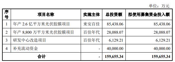 百佳年代原拟募集资金159,655.34万元,分别用于年产2.6亿平方米光伏胶膜项目、年产8,800万平方米光伏胶膜项目、研发中心改造项目、补充流动资金。