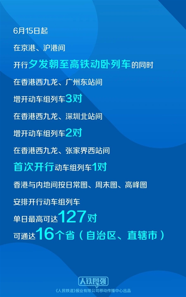 6月15日起,在京港、沪港间开行夕发朝至高铁动卧列车的同时,在香港西九龙、广州东站间增开动车组列车3对,在香港西九龙、深圳北站间增开动车组列车2对。