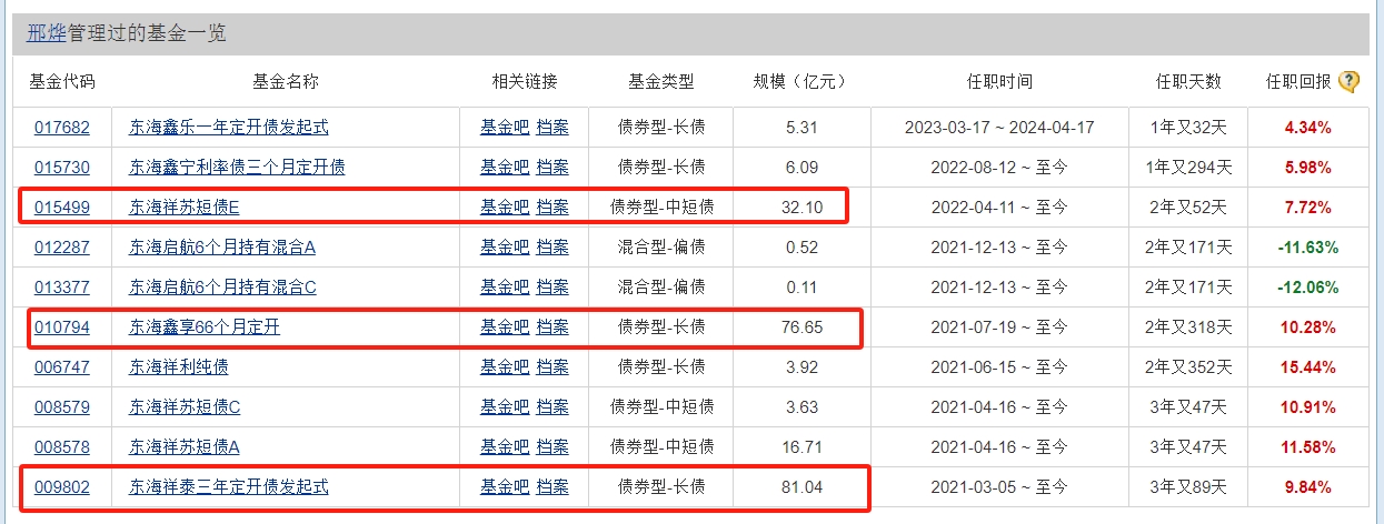 其中,邢烨主要管理的其实是债券型基金,东海基金规模较大的几只债券型基金都有其参与。