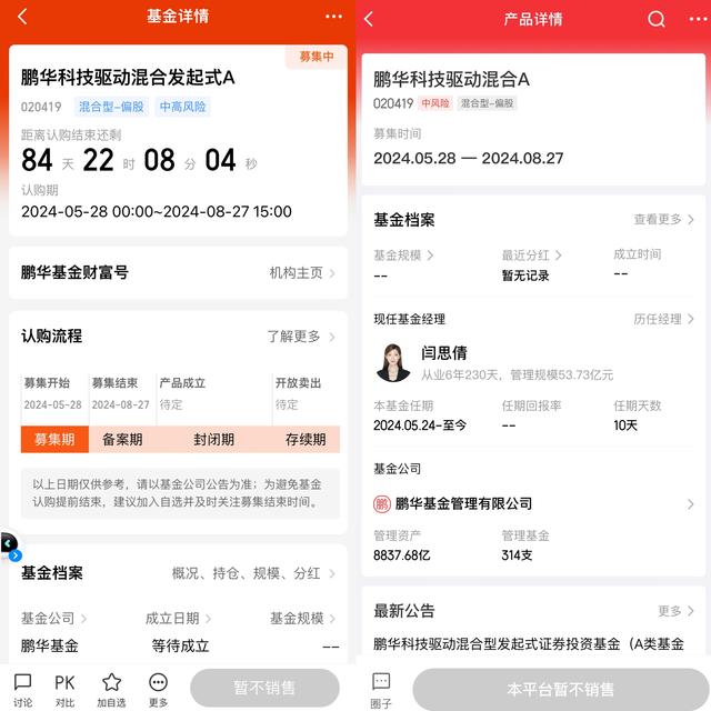 红星资本局在蚂蚁财富、天天基金、京东等常见基金代销平台上看到,鹏华科技驱动混合目前处于募集期,但均显示“暂不销售”。