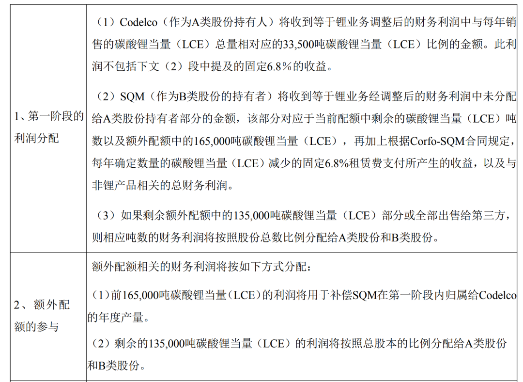此外,如果剩余额外配额中的13.5万吨碳酸锂当量(LCE)部分或全部出售给第三方,则相应吨数的财务利润将按照股份总数比例分配给A类股份和B类股份。