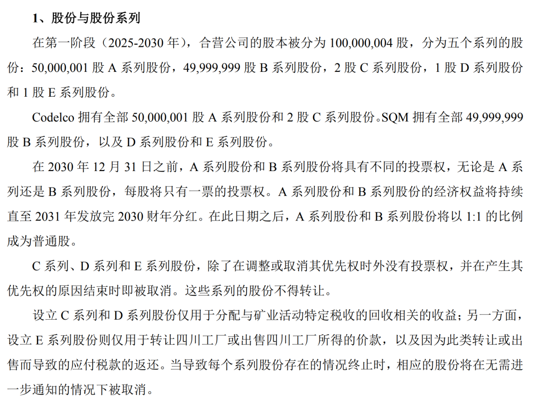其中,Codelco拥有全部50000001股A系列股份和2股C系列股份。SQM则拥有全部49999999股B系列股份,以及D系列股份和E系列股份。在2030年12月31日之前,无论是A系列还是B系列股份,每股将只有一票的投票权。