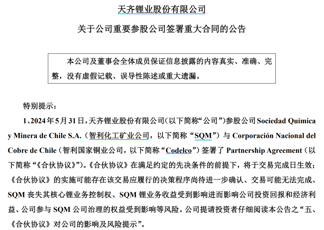 天齐锂业最新公告显示,5月31日,SQM公告其与Codelco签署了《合伙协议》。