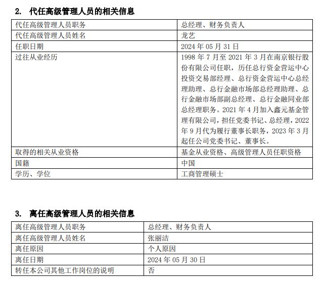 6月1日,鑫元基金公告称,公司总经理、财务负责人张丽洁因个人原因于5月30日离任,不再转任公司其他岗位,上述职务暂由董事长龙艺代行。