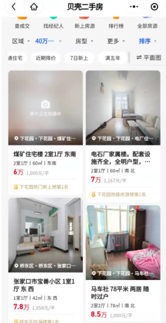从贝壳二手房页面可以看到,张家口市下花园区煤矿住宅楼小区出现了1000元/㎡的房子,面积为60㎡,房型为两室一厅,总价低至6万元。同一个区域的电石厂家属楼、马车社等小区也出现了低价房源,单价均为1100元/㎡左右,总价在7-9万元不等。而下花园区其他小区房价则在3000-6000元/㎡左右。