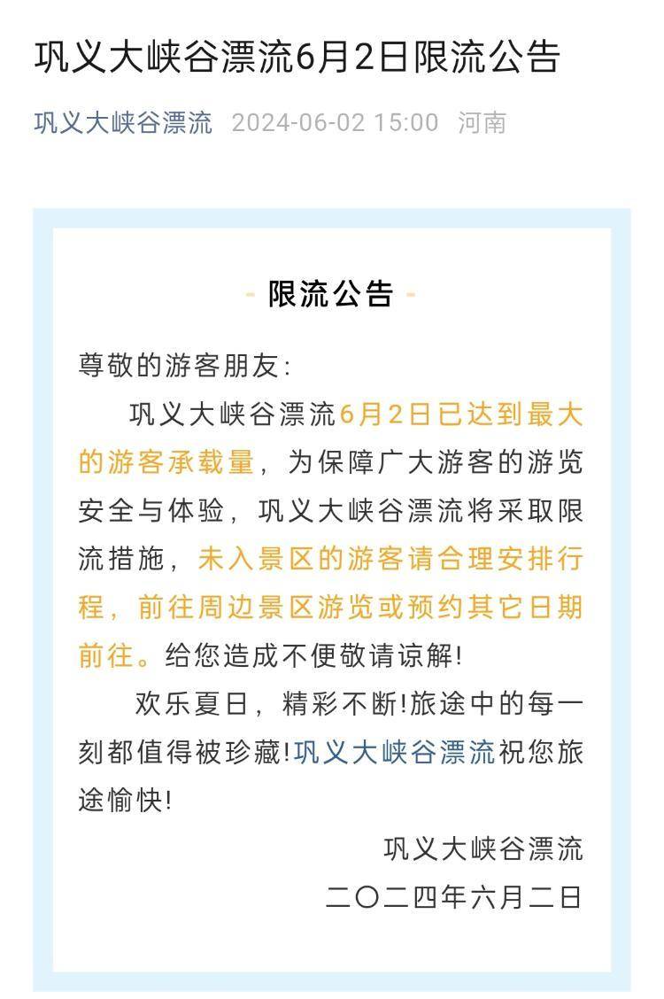 记者看到,6月2日下午,巩义大峡谷漂流官方微信公众号曾发布《限流公告》称, 巩义大峡谷漂流6月2日已达到最大的游客承载量,为保障广大游客的游览安全与体验,将采取限流措施,未入景区的游客请合理安排行程,前往周边景区游览或预约其它日期前往。