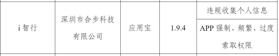 其中,i智行1.9.4版本,涉及违规收集个人信息和APP强制、频繁、过度索取权限。